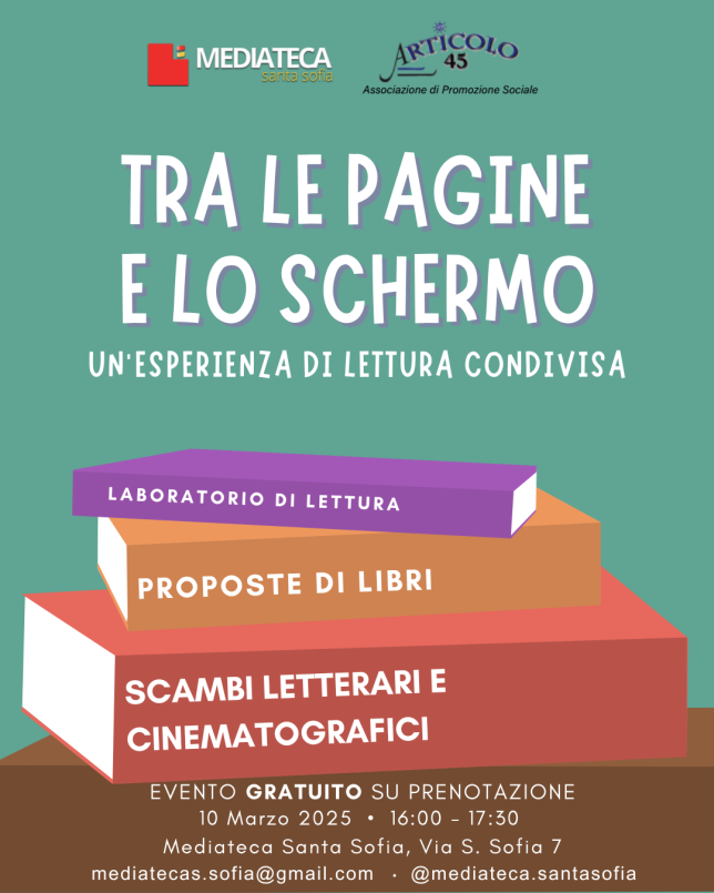 “Tra le pagine e lo schermo” è un laboratorio di lettura condivisa che ha l’obiettivo di creare uno spazio in cui scambiarsi idee, opinioni, riflessioni non solo letterarie, ma anche cinematografiche. Ci incontriamo per condividere le nostre conoscenze e accogliere pensieri e intuizioni, al fine di costruire un ponte tra la pagina scritta e l’audiovisivo. Il primo incontro del 10 marzo sarà un’occasione per conoscersi attraverso i libri che ognuno di voi sceglierà di portare come proposta di lettura. Sono consigliati testi che hanno avuto trasposizioni filmiche o i cui temi abbiamo a che fare anche indirettamente con il mondo del cinema. Il laboratorio è aperto a tutte/i, per partecipare non è necessaria nessuna esperienza pregressa.